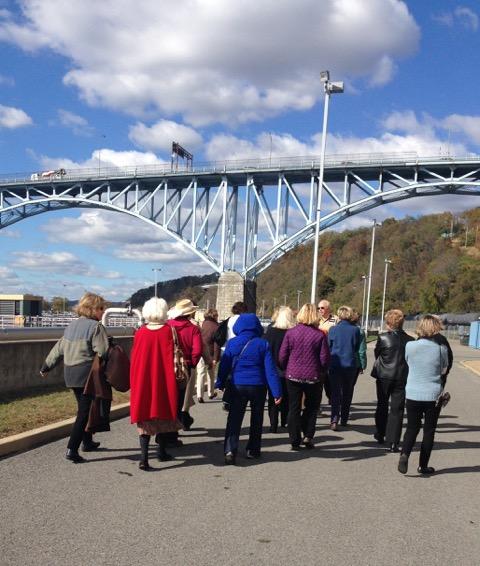 As we walked through the plant, Findley noted that ALCOSAN maintains 90 miles of pipeline along the rivers and processes up to 250 million gallons of wastewater a day. Below, Debbie Scully and Linda Ban gaze over the river where the processed wastewater spills back into the Ohio River – at that spot, approximately 120,000 gallons a minute.